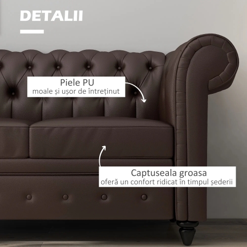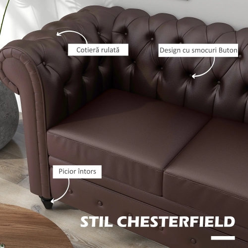 CANAPEA STIL CHESTERFIELD: Cautati o canapea cu stilul ideal pentru orice amenajare si ocazie? Aceasta canapea cu 2 locuri este perfecta pentru dumneavoastra. Datorita tapiteriei sale din piele ecologica si a spatarului cu nasturi, prezenta sa va aduce o nota de eleganta in camera, in living sau in birou.