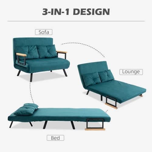 HOMCOM Canapea Dubla Extensibila 3 in 1 Catifea cu Spatar Reglabil pe 5 Niveluri si Perne Capitonate, Verde marin